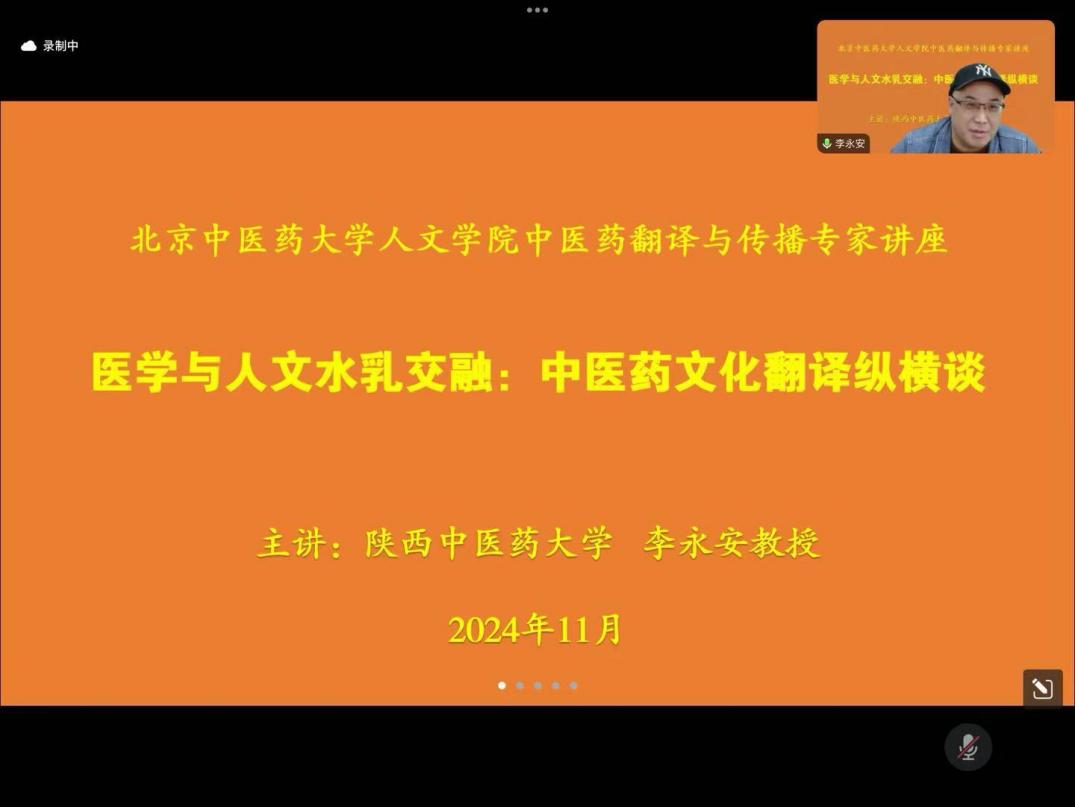 2024年11月18日晚19点,永利yl23411官网特邀陕西中医药大学外语学院院长李永安教授通过线上腾讯会议方式为永利yl23411官网师生带来“医学与人文水乳交融:中医药文化翻译纵横谈”专题讲座。永利yl23411官网英语教师和学生近八十人参加讲座,讲座由孔祥国副院长主持。