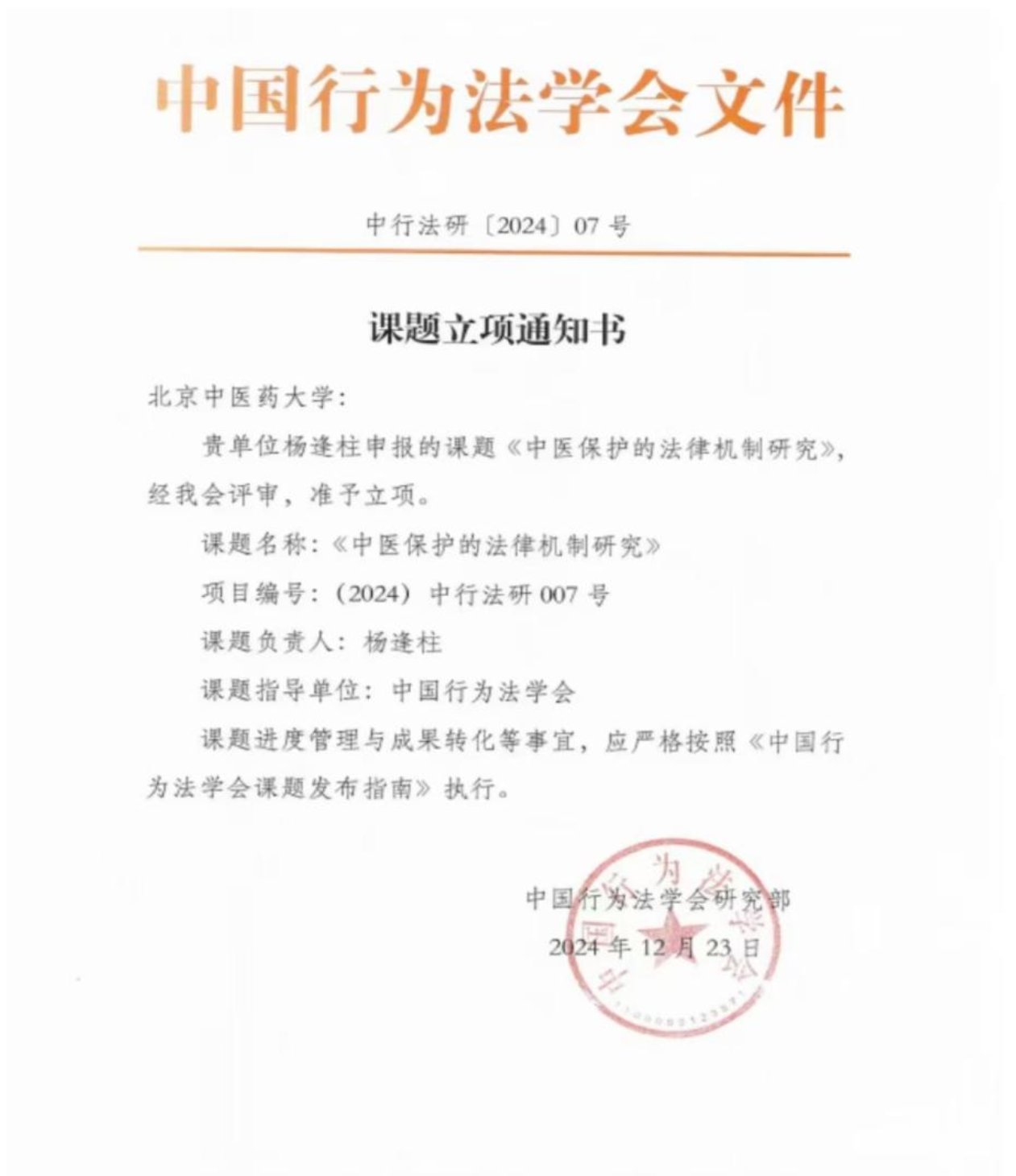 日前,从中国行为法学会获悉,永利yl23411官网党委委员、法律系主任杨逢柱副教授申报的《中医保护的法律机制研究》获得立项。该课题的获批是杨逢柱副教授团队长期以来聚焦中医药发展,深耕中医药法律与政策研究的结果,更是永利yl23411官网不断加强医药卫生法学建设的重要成效。