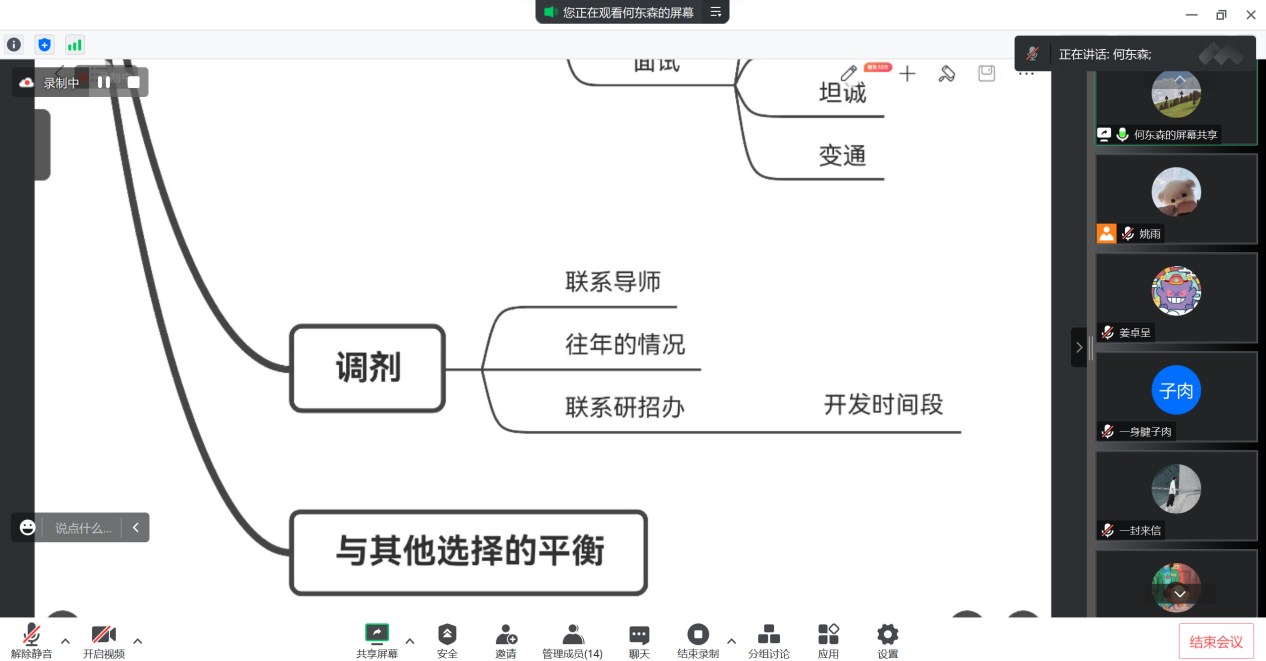 之后,何东森为我们介绍了她复试和调剂的经验。复试准备过程中可以通过做思维导图来抓住重点、有针对性地准备。调剂时查找往年的调剂信息可以关注学校官网、微博博主,利用小程序、app等,把握住学校放开调剂的时间。